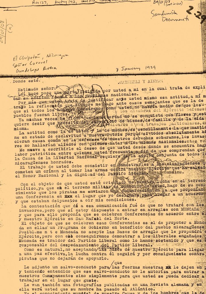 Uno de los pasajes más reveladores del documento es la clara distinción que Sandino establece entre los invasores extranjeros, a quienes denomina “piratas”, y los actores políticos nacionales subordinados a ellos. El General es categórico: no negociará jamás con los invasores.